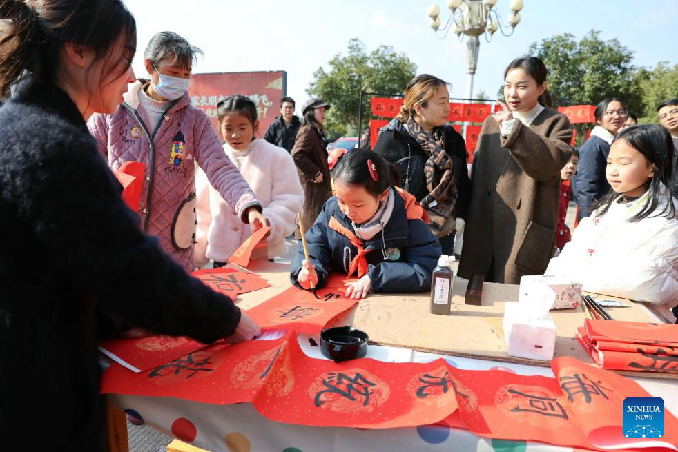 BEIJING, 8 febrero, 2026 (Xinhua) -- Estudiantes escriben coplas de primavera en una escuela primaria, en Dongyang, en la provincia de Zhejiang, en el este de China, el 8 de febrero de 2026. Varias actividades extracurriculares están disponibles para los estudiantes a lo largo de China durante las vacaciones de invierno. (Xinhua/Bao Kangxuan)