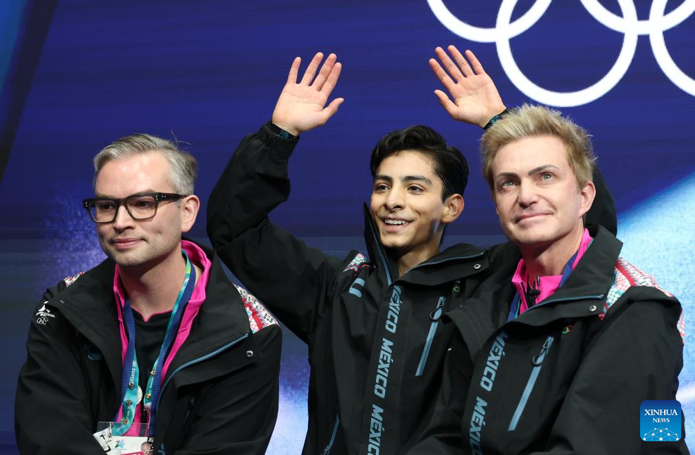 MILAN, 11 febrero, 2026 (Xinhua) -- Imagen del 10 de febrero de 2026 de Donovan Carrillo (c), de México, reaccionando mientras espera las puntuaciones durante la competencia del programa corto de patinaje individual masculino de patinaje artístico en los Juegos Olímpicos de Invierno Milán-Cortina 2026, en Milán, Italia. (Xinhua/Li Ming)