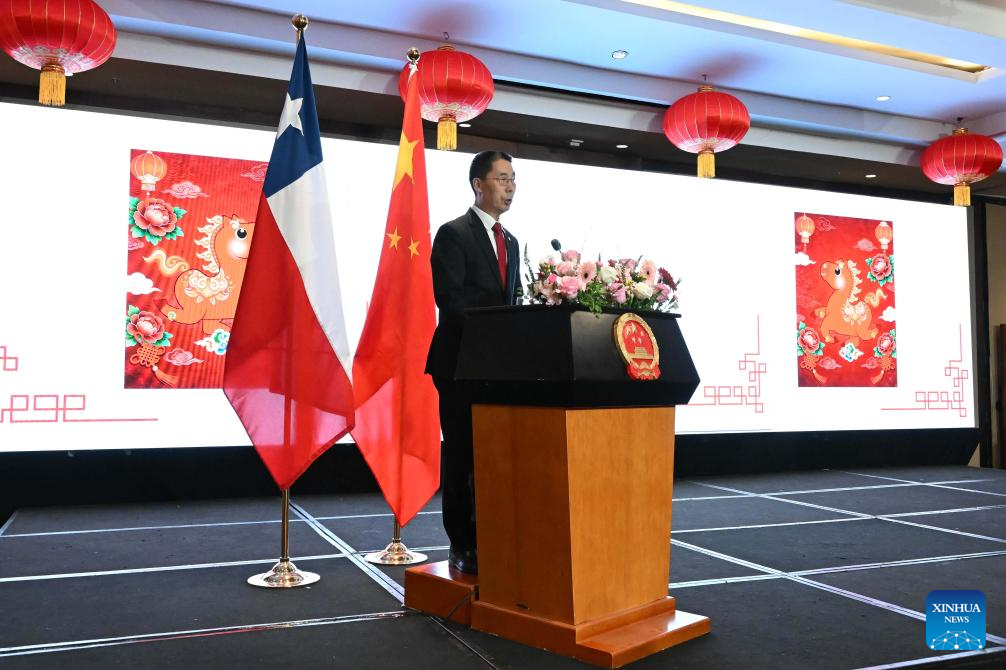 SANTIAGO, 11 feb (Xinhua) -- Autoridades y representantes de empresas, gremios e instituciones educativas de Chile y China celebraron el martes la inminente llegada del Año Nuevo chino, en una recepción organizada por la embajada china en el país austral, para dar la bienvenida al Año del Caballo del horóscopo tradicional chino.