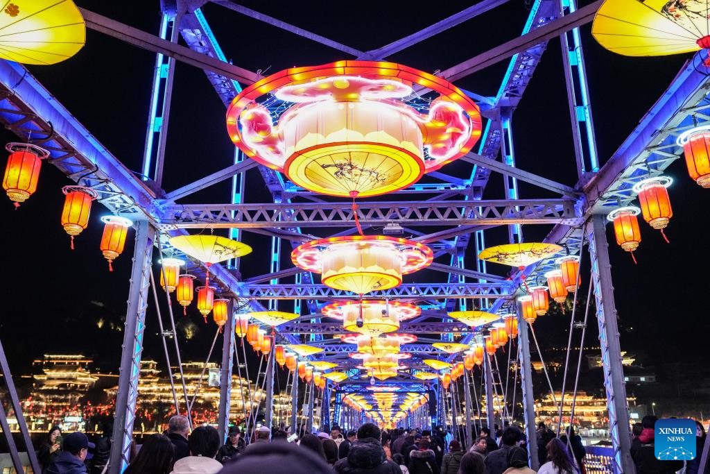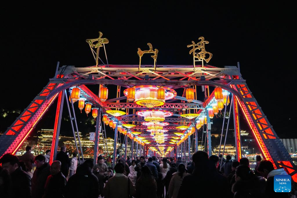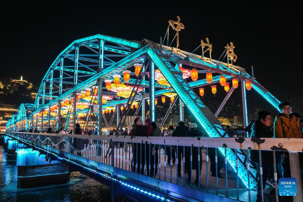 Imagen del 10 de febrero de 2026 de personas visitando el puente Zhongshan decorado con linternas, en Lanzhou, en la provincia de Gansu, en el noroeste de China. Con la Fiesta de la Primavera aproximándose, se llevan a cabo eventos festivos en toda China para marcar el comienzo de la celebración. (Xinhua/Lang Bingbing)