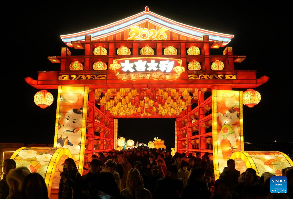 Imagen del 10 de febrero de 2026 de personas disfrutando de las linternas en la ciudad antigua de Zhengding, en Shijiazhuang, en la provincia de Hebei, en el norte de China. Con la Fiesta de la Primavera aproximándose, se llevan a cabo eventos festivos en toda China para marcar el comienzo de la celebración. (Xinhua/Yang Shiyao)
