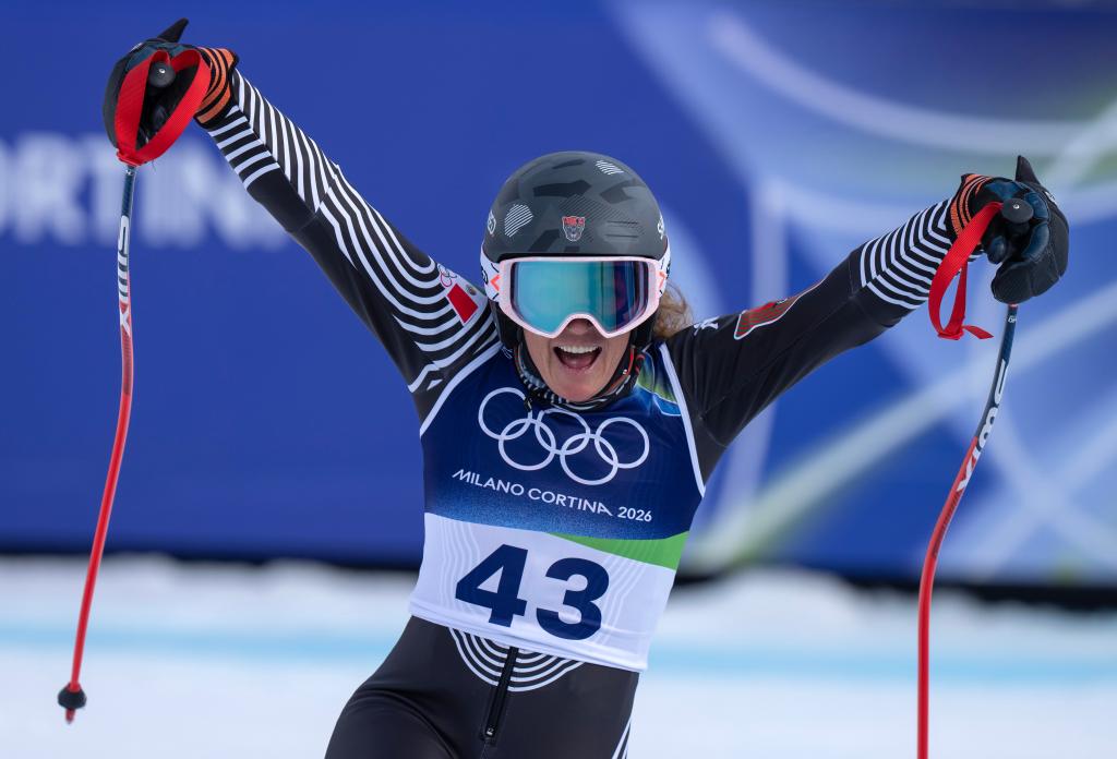 CORTINA D'AMPEZZO, 12 febrero, 2026 (Xinhua) -- Sarah Schleper, de México, festeja al término del super-G femenino de esquí alpino en los Juegos Olímpicos de Invierno Milán-Cortina 2026, en Cortina D'Ampezzo, Italia, el 12 de febrero de 2026. (Xinhua/Fei Maohua)