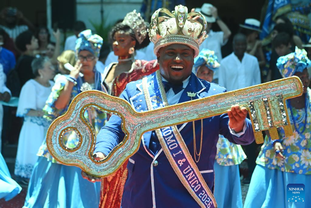 El rey Momo del Carnaval, Danilo Vieira, sonríe después de recibir las llaves de la ciudad en la ceremonia de inauguración de la temporada de Carnaval 2026, en Río de Janeiro, Brasil, el 13 de febrero de 2026. La temporada de Carnaval 2026 en Brasil tendrá un impacto económico calculado en 18.600 millones de reales (unos 3.720 millones de dólares), lo que significará 10 por ciento más frente al mismo período del año anterior y el mejor resultado para el período desde el inicio de la serie histórica en 2011, según estimaciones del Gobierno y del sector privado. (Xinhua/Lucio Tavora)