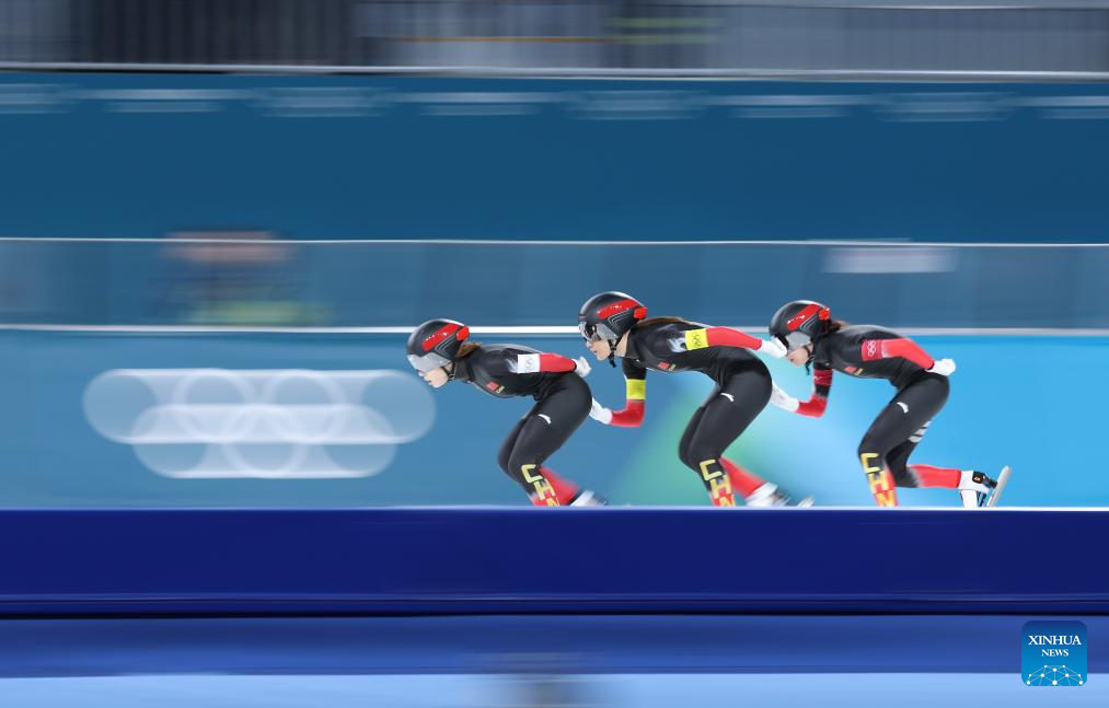 MILAN, 14 febrero, 2026 (Xinhua) -- Atletas del equipo de China compiten durante los cuartos de final de persecución por equipos femenino de patinaje de velocidad en los Juegos Olímpicos de Invierno Milán-Cortina 2026, en Milán, Italia, el 14 de febrero de 2026. (Xinhua/Li Jing)