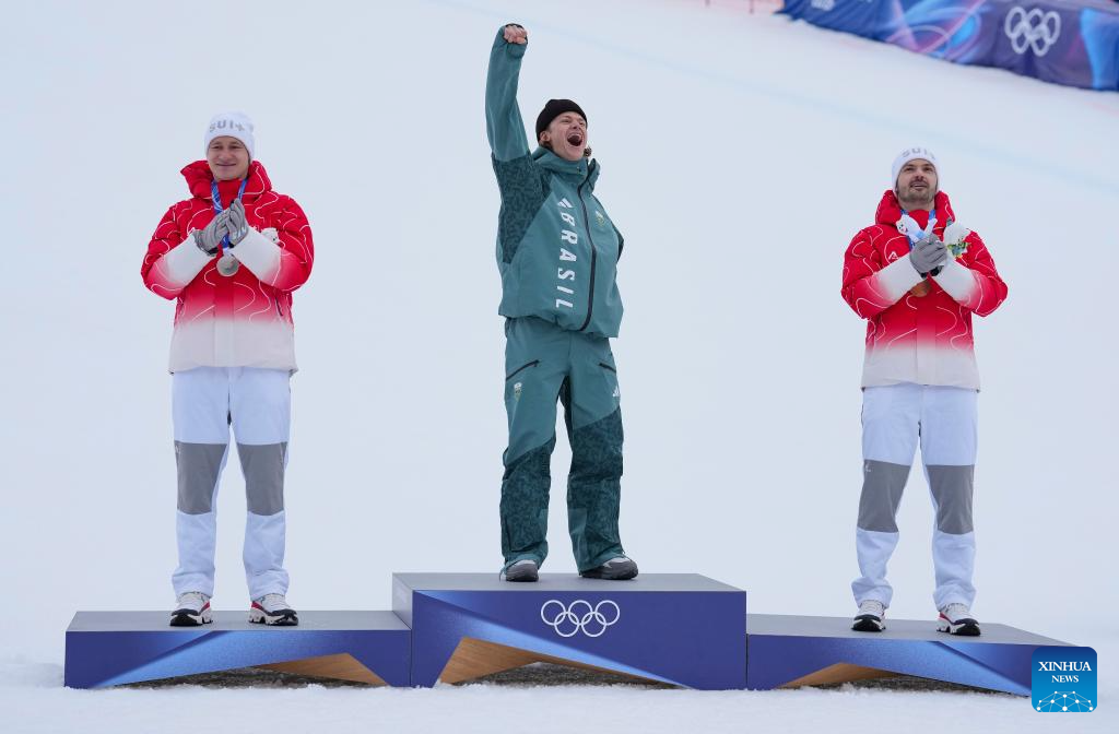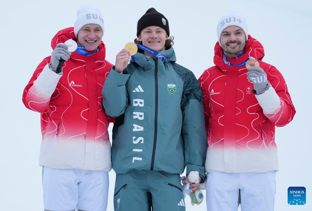 BORMIO, 14 febrero, 2026 (Xinhua) -- El medallista de oro Lucas Pinheiro Braathen (c), de Brasil, el medallista de plata Marco Odermatt (i), de Suiza, y el medallista de bronce Loic Meillard, de Suiza, posan para fotografías durante la ceremonia de premiación del evento de eslalon gigante masculino de esquí alpino en los Juegos Olímpicos de Invierno Milán-Cortina 2026, en Bormio, Italia, el 14 de febrero de 2026. (Xinhua/Hu Huhu)