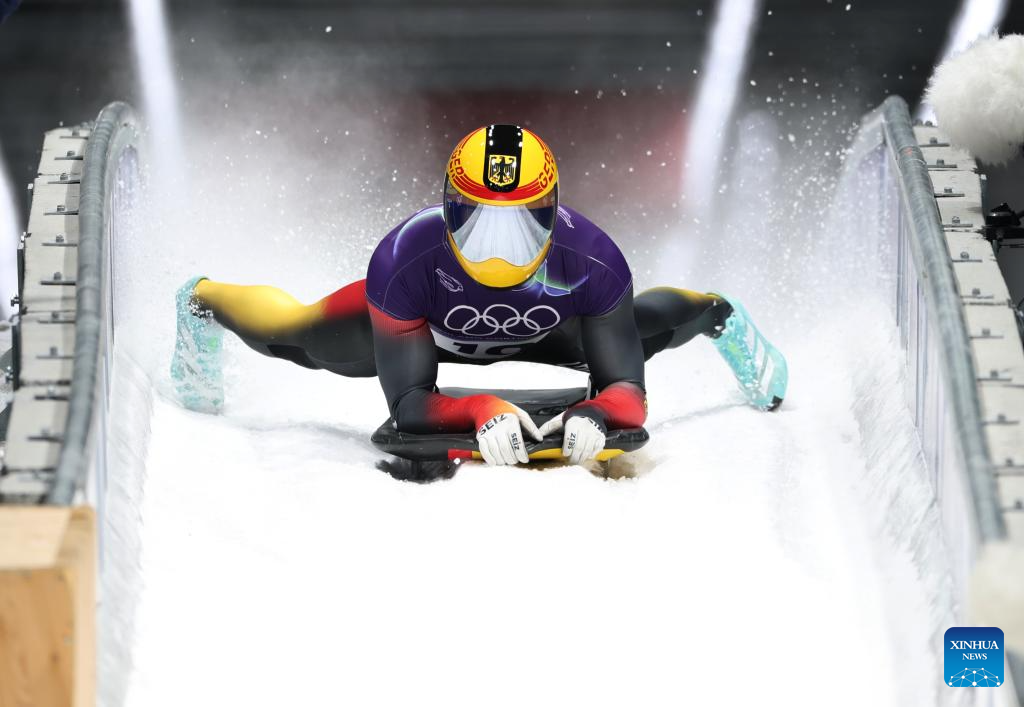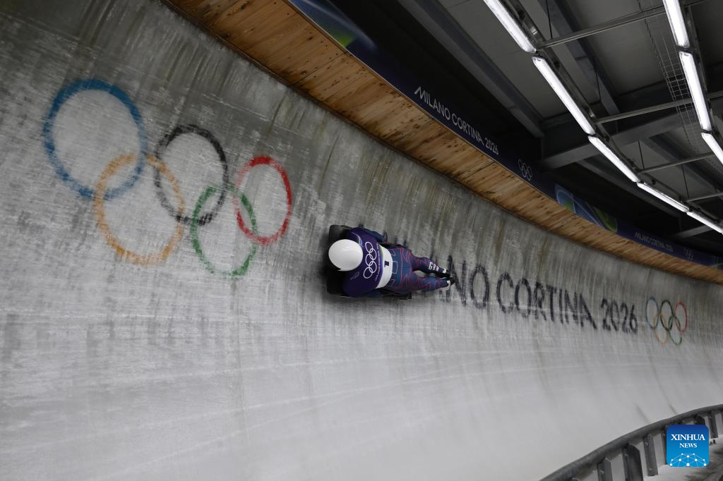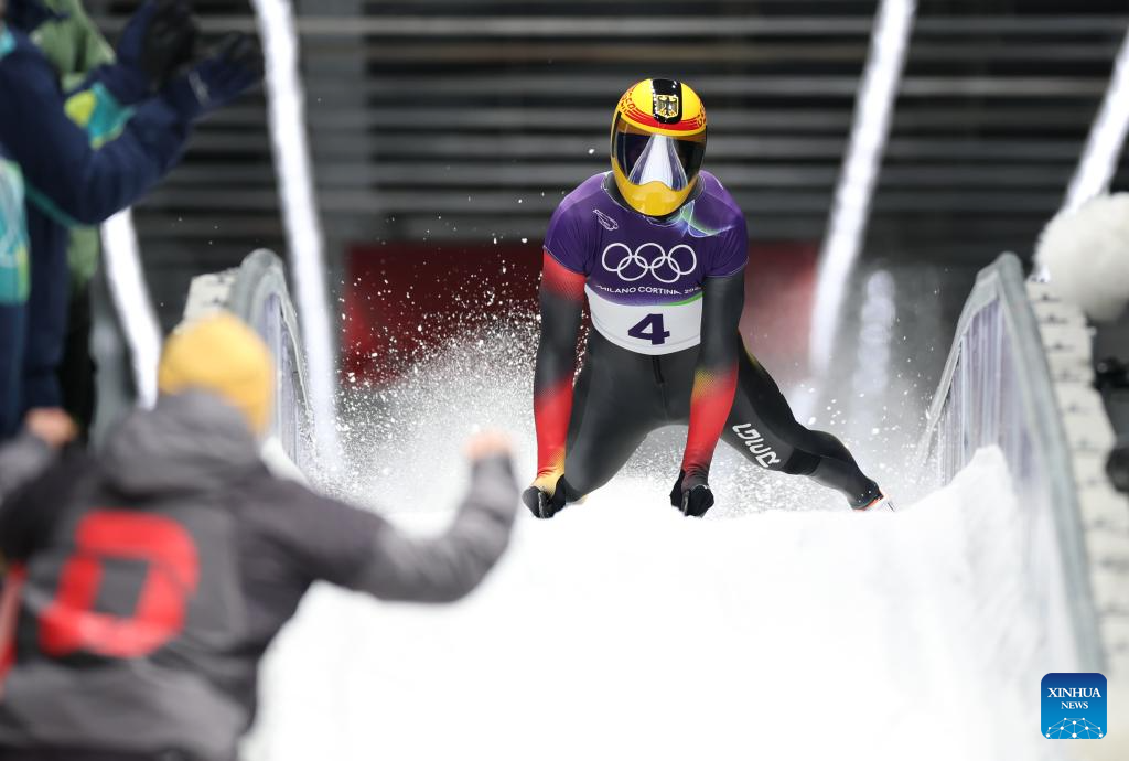 CORTINA D'AMPEZZO, 14 febrero de 2026 (Xinhua) -- Imagen del 13 de febrero de 2026 de Christopher Grotheer, de Alemania, reaccionando tras cruzar la línea de meta durante la serie 4 de la competencia de skeleton masculino en los Juegos Olímpicos de Invierno Milán-Cortina 2026, en Cortina, Italia. (Xinhua/Ding Xu)