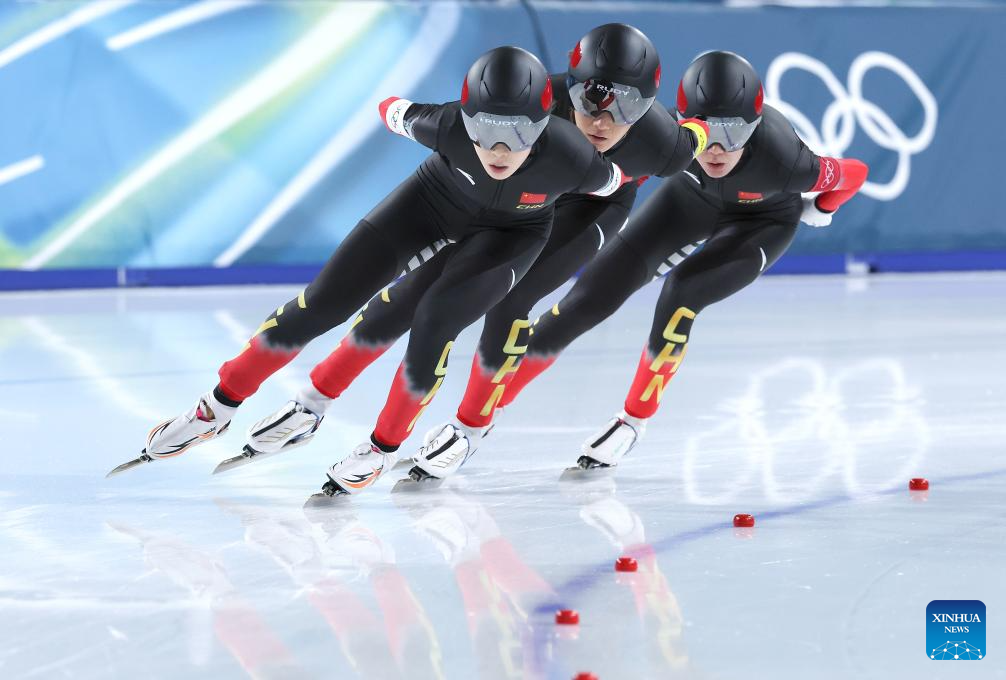 MILAN, 14 febrero, 2026 (Xinhua) -- Atletas del equipo de China compiten durante los cuartos de final de persecución por equipos femenino de patinaje de velocidad en los Juegos Olímpicos de Invierno Milán-Cortina 2026, en Milán, Italia, el 14 de febrero de 2026. (Xinhua/Du Xiaoyi)