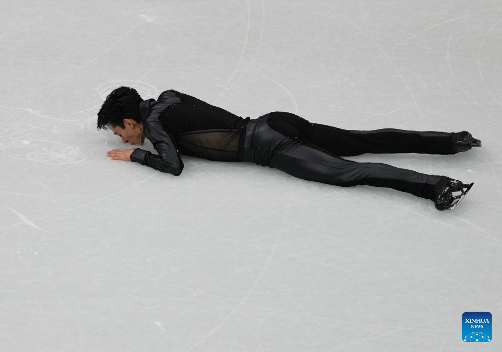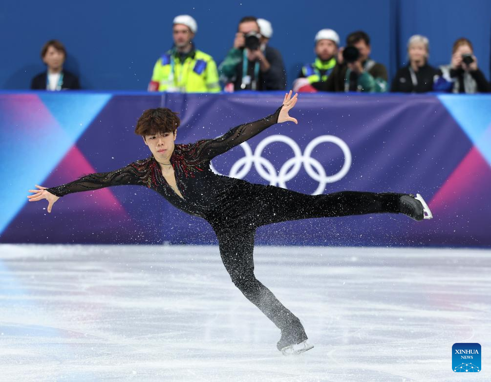 MILAN, 14 febrero, 2026 (Xinhua) -- Imagen del 13 de febrero de 2026 de Sato Shun, de Japón, realizando una presentación durante el programa libre de patinaje individual masculino de patinaje artístico en los Juegos Olímpicos de Invierno Milán-Cortina 2026, en Milán, Italia. (Xinhua/Li Ming)