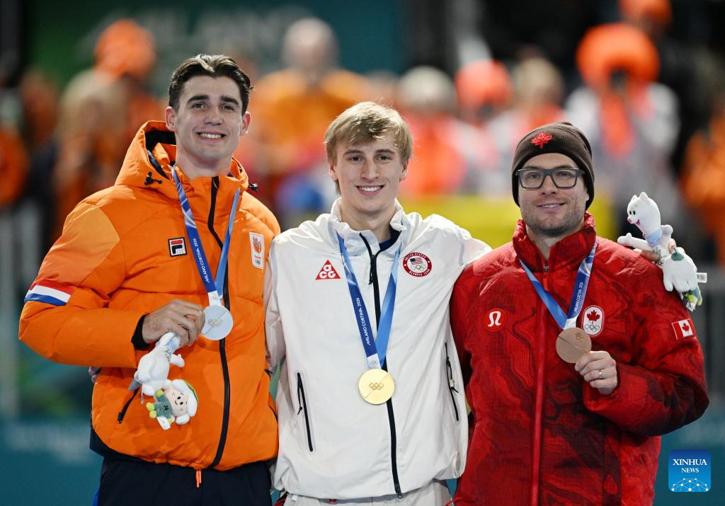 MILAN, 14 febrero, 2026 (Xinhua) -- El medallista de oro, Jordan Stolz (c), de Estados Unidos, el medallista de plata, Jenning de Boo (i), de Países Bajos, y el medallista de bronce, Laurent Dubreuil, de Canadá, posan para fotografías durante la ceremonia de premiación de la final de 500m masculinos de patinaje de velocidad en los Juegos Olímpicos de Invierno Milán-Cortina 2026, en Milán, Italia, el 14 de febrero de 2026. (Xinhua/Wu Wei)