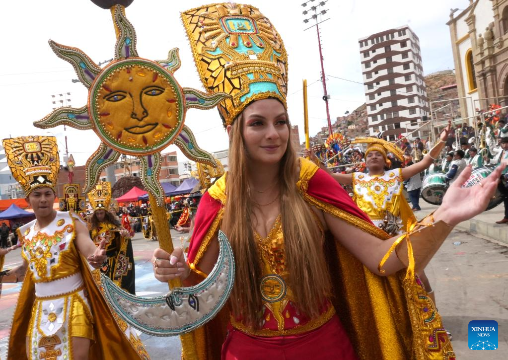ORURO, 14 febrero, 2026 (Xinhua) -- Integrantes de la Fraternidad Hijos del Sol participan en el Carnaval de Oruro, en la ciudad de Oruro, Bolivia, el 14 de febrero de 2026. (Xinhua/Javier Mamani)