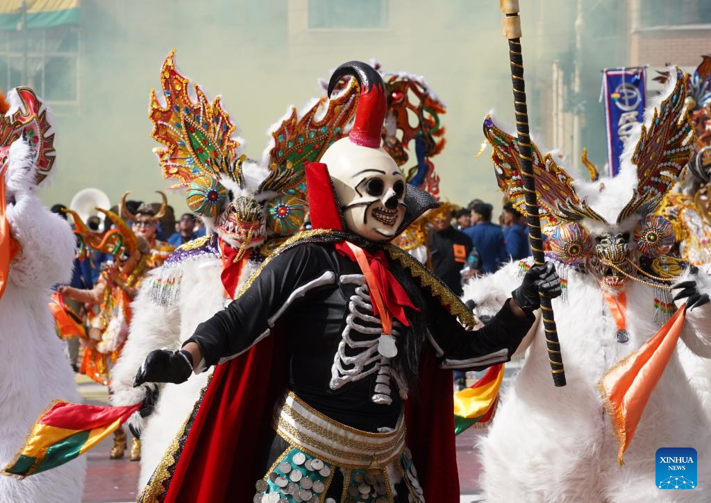 ORURO, 14 febrero, 2026 (Xinhua) -- Integrantes de la Fraternidad Folclórica Llamerada Socavón participan en el Carnaval de Oruro, en la ciudad de Oruro, Bolivia, el 14 de febrero de 2026. (Xinhua/Javier Mamani)