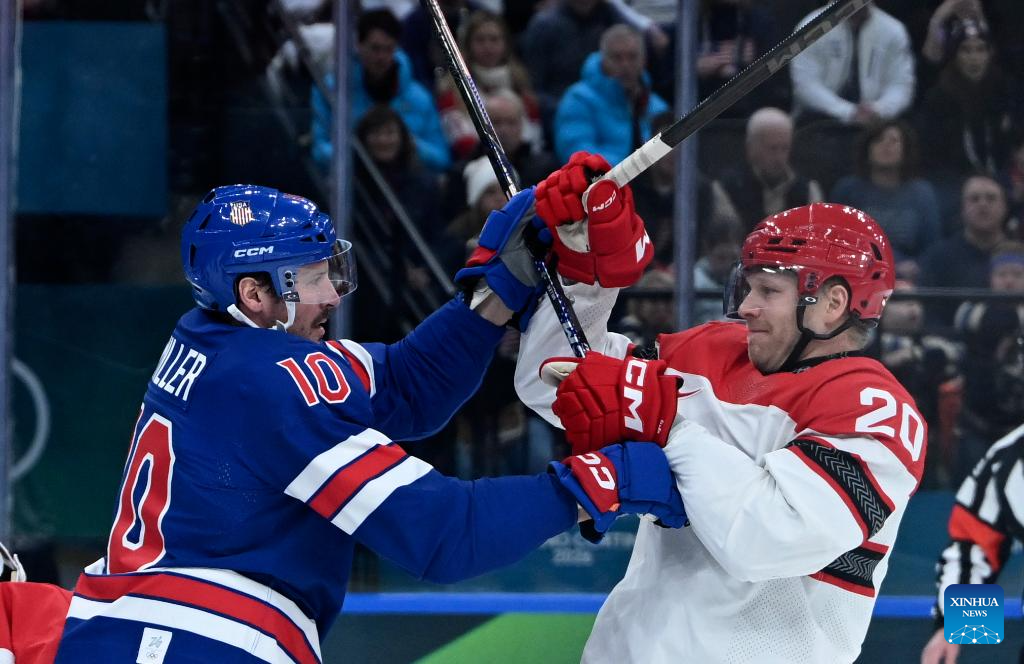 MILAN, 15 febrero, 2026 (Xinhua) -- Imagen del 14 de febrero de 2026 de jugadores compitiendo durante el partido del grupo C de la ronda preliminar masculina entre Estados Unidos y Dinamarca de hockey sobre hielo en los Juegos Olímpicos de Invierno Milán-Cortina 2026, en Milán, Italia. (Xinhua/Zhang Haofu)