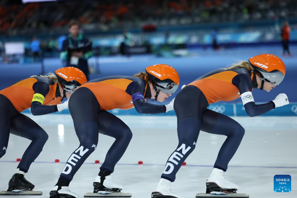 MILAN, 15 febrero, 2026 (Xinhua) -- Imagen del 14 de febrero de 2026 del equipo de Países Bajos compitiendo durante los cuartos de final de persecución por equipos femenino de patinaje de velocidad en los Juegos Olímpicos de Invierno Milán-Cortina 2026, en Milán, Italia. (Xinhua/Li Jing)