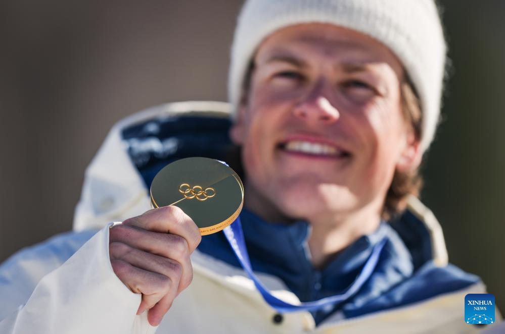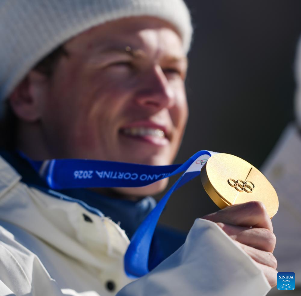 TESERO, 15 febrero, 2026 (Xinhua) -- Johannes Hoesflot Klaebo, de Noruega, muestra su medalla de oro durante la ceremonia de premiación del relevo 4x7,5 km masculino de esquí de fondo en los Juegos Olímpicos de Invierno Milán-Cortina 2026, en Tesero, Italia, el 15 de febrero de 2026. (Xinhua/Peng Ziyang)