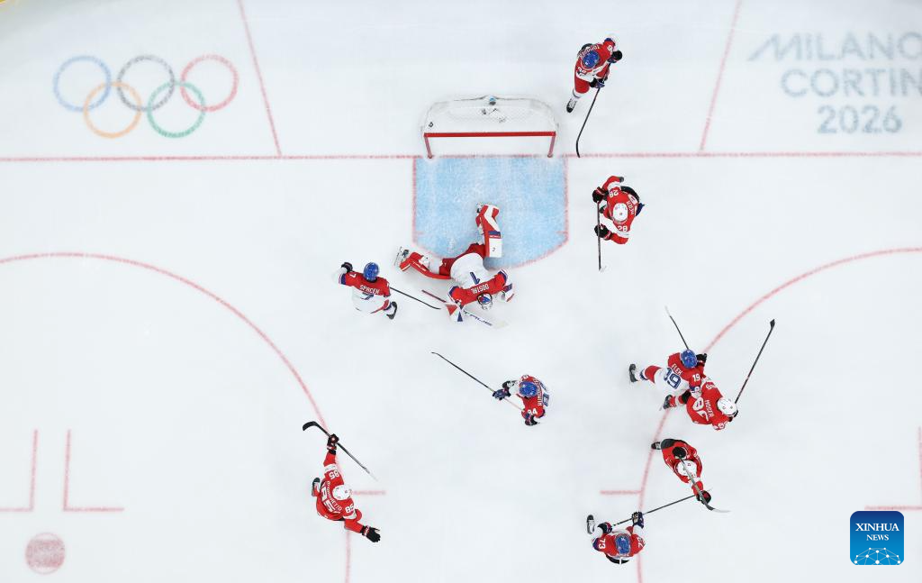 MILAN, 15 febrero, 2026 (Xinhua) -- Roman Cervenka, de República Checa, pasa junto a jugadores de Suiza después de perder el partido de la ronda preliminar del grupo A entre Suiza y República Checa en los Juegos Olímpicos de Invierno Milán-Cortina 2026, en Milán, Italia, el 15 de febrero de 2026. (Xinhua/Tao Xiyi)