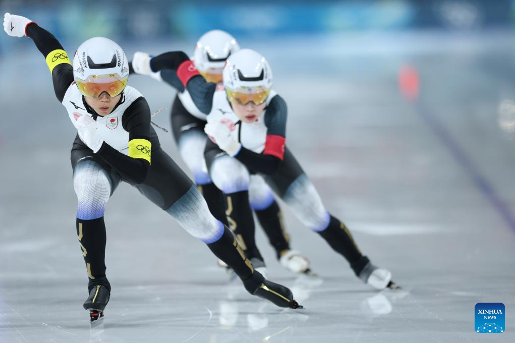 MILAN, 15 febrero, 2026 (Xinhua) -- Imagen del 14 de febrero de 2026 del equipo de Japón compitiendo durante los cuartos de final de persecución por equipos femenino de patinaje de velocidad en los Juegos Olímpicos de Invierno Milán-Cortina 2026, en Milán, Italia. (Xinhua/Li Jing)