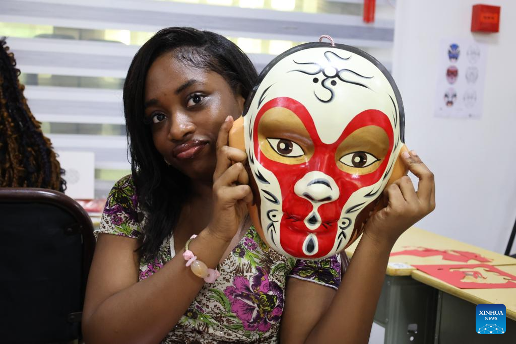 ACRA, 15 febrero, 2026 (Xinhua) -- Imagen del 13 de febrero de 2026 de una estudiante posando para fotografía con una máscara, en Acra, Ghana. El Instituto Confucio de la Universidad de Ghana organizó el viernes una fiesta de Año Nuevo en el jardín para estudiantes de Ghana antes del Festival de la Primavera chino, ofreciendo una animada introducción a la cultura china. (Xinhua/Seth)