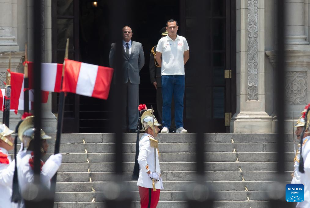 El presidente peruano, José Jerí -(d-frente), participa en la ceremonia de cambio de guardia en el Palacio de Gobierno, en Lima, Perú, el 17 de febrero de 2026. El Congreso de Perú aprobó el martes, con 75 votos a favor y 24 en contra, las siete mociones de censura presentadas por varias bancadas contra el presidente José Jerí, por lo que deberá abandonar el cargo de manera inmediata. (Xinhua/Mariana Bazo)