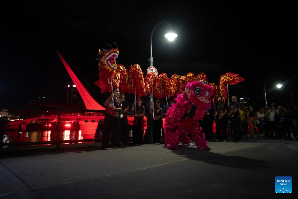 BUENOS AIRES, 17 febrero, 2026 (Xinhua) -- Imagen del 16 de febrero de 2026 de artistas marciales de la escuela Lung Chuan realizando las danzas del dragón y del león frente al Puente de la Mujer durante un recorrido en un autobús turístico por monumentos iluminados de rojo durante las celebraciones por el Año Nuevo chino, en la ciudad de Buenos Aires, capital de Argentina. La ciudad de Buenos Aires, capital de Argentina, se engalanó de rojo la noche del lunes para festejar la llegada del Año Nuevo chino iluminando monumentos, edificios y paseos emblemáticos a lo largo de diferentes barrios porteños. (Xinhua/Martín Zabala)