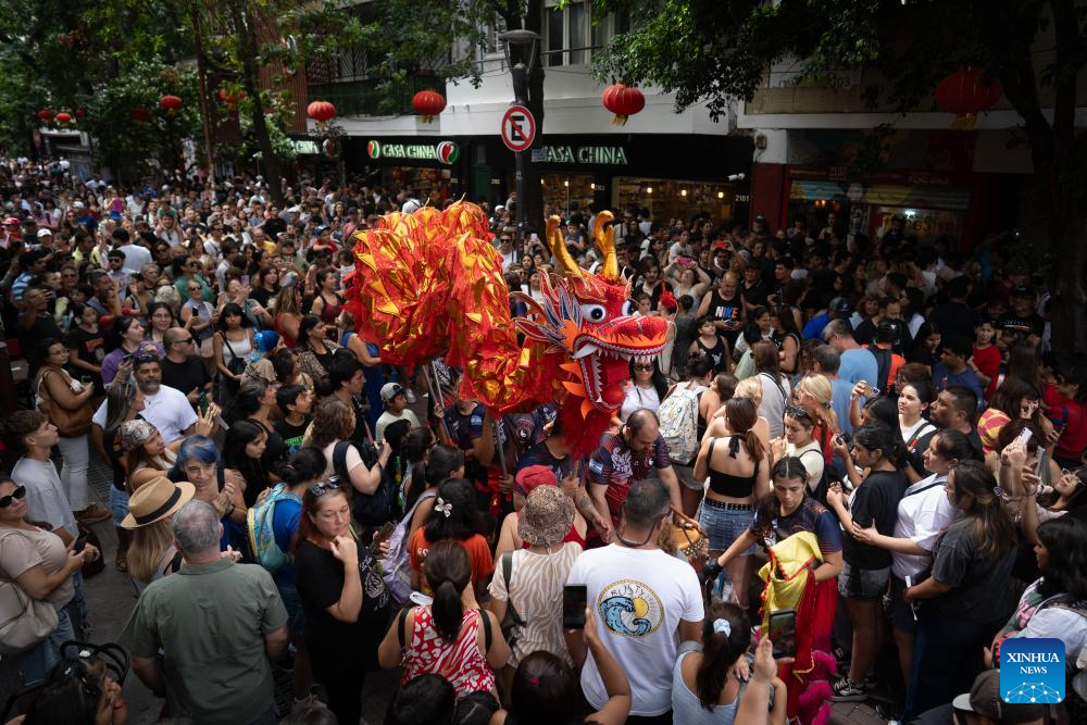 BUENOS AIRES, 17 febrero, 2026 (Xinhua) -- Imagen del 16 de febrero de 2026 de artistas marciales de la escuela Lung Chuan realizando una presentación de la danza del dragón durante las celebraciones por el Año Nuevo chino, en el Barrio Chino, en la ciudad de Buenos Aires, capital de Argentina. El Barrio Chino de Buenos Aires celebró el lunes la llegada del Año Nuevo chino o Fiesta de la Primavera con un multitudinario evento lleno de color y emoción que ofreció arte, cultura, música, moda, baile y gastronomía de China. (Xinhua/Martín Zabala)
