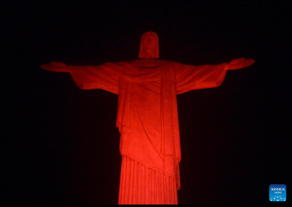 RIO DE JANEIRO, 17 febrero, 2026 -- Imagen del 16 de febrero de 2026 de la estatua del Cristo Redentor iluminado de rojo para celebrar el Año Nuevo chino, en Río de Janeiro, Brasil. (Xinhua/Lucio Tavora)