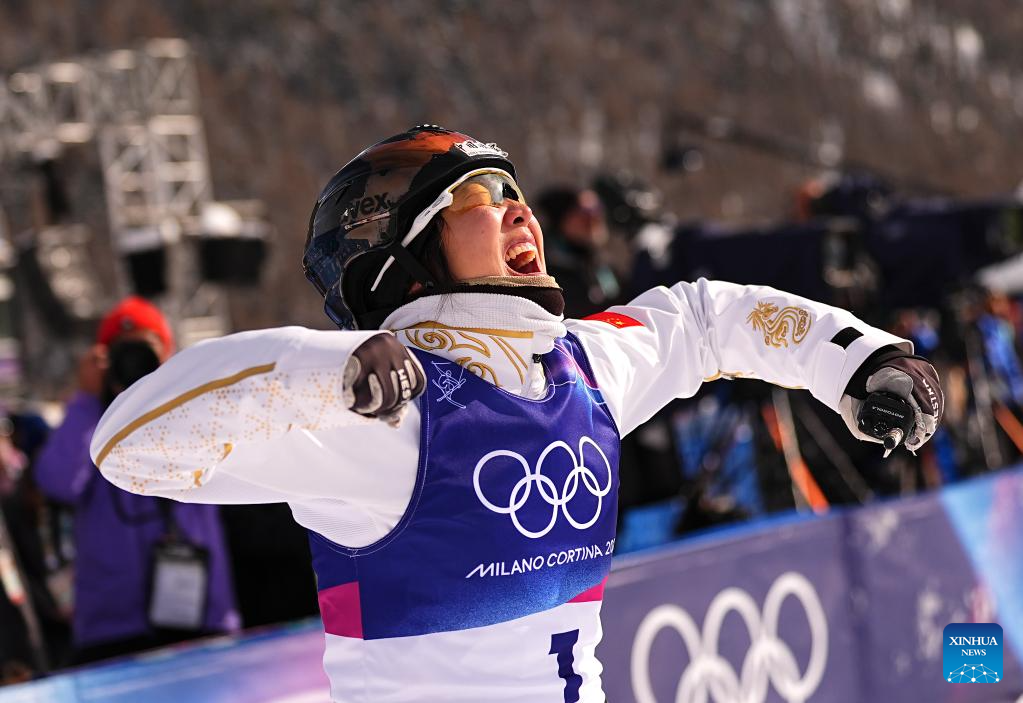 LIVIGNO, 18 febrero, 2026 (Xinhua) -- Xu Mengtao, de China, festeja al término de la final 2 de aerials femenino de esquí acrobático en los Juegos Olímpicos de Invierno Milán-Cortina 2026, en Livigno, Italia, el 18 de febrero de 2026. (Xinhua/Wu Huiwo)