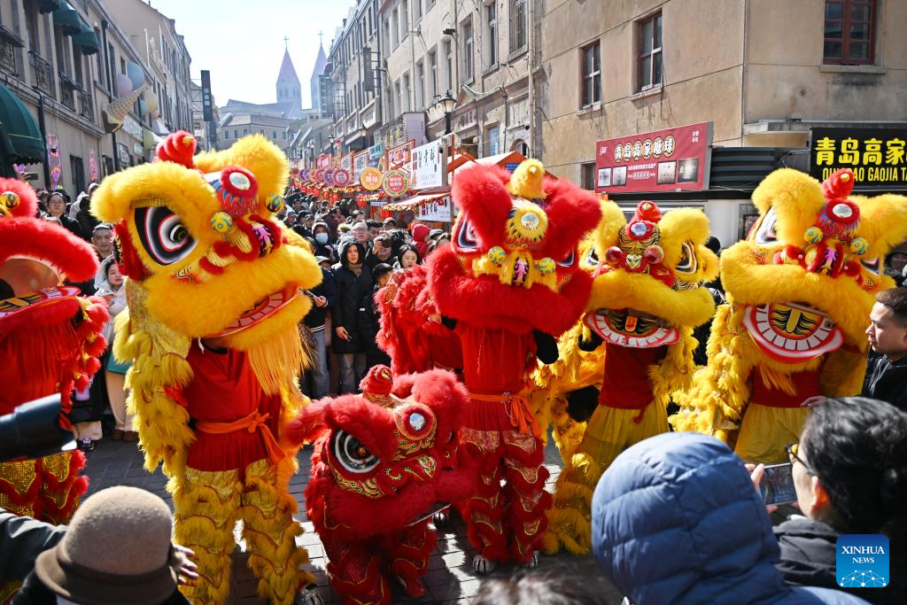 QINGDAO, 18 febrero, 2026 (Xinhua) -- Imagen del 17 de febrero de 2026 de visitantes observando una presentación de la danza del león, en Qingdao, en la provincia de Shandong, en el este de China. Durante las vacaciones de la Fiesta de la Primavera, las personas en Qingdao participaron en varios eventos para experimentar el ambiente festivo. (Xinhua/Li Ziheng)