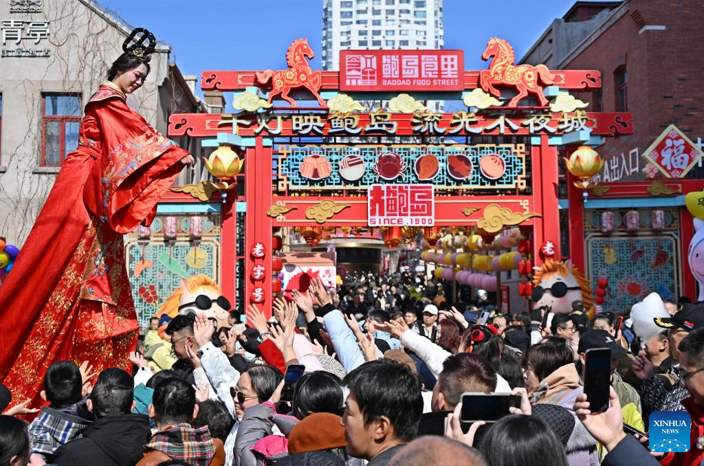 QINGDAO, 18 febrero, 2026 (Xinhua) -- Imagen del 17 de febrero de 2026 de una artista interactuando con visitantes en un bloque cultural y de ocio, en Qingdao, en la provincia de Shandong, en el este de China. Durante las vacaciones de la Fiesta de la Primavera, las personas en Qingdao participaron en varios eventos para experimentar el ambiente festivo. (Xinhua/Li Ziheng)