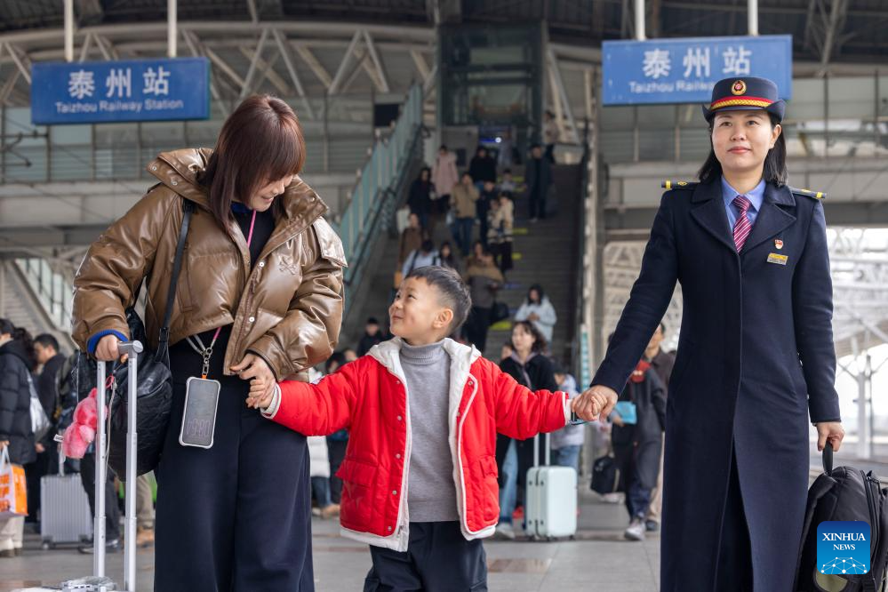 BEIJING, 19 febrero, 2026 (Xinhua) -- Una empleada ayuda a pasajeros a abordar un tren en la Estación del Ferrocarril de Taizhou, en la ciudad de Taizhou, en la provincia de Jiangsu, en el este de China, el 19 de febrero de 2026. Durante la temporada de viajes de la Fiesta de la Primavera, los departamentos de aviación civil, ferrocarriles y otros han aumentado la capacidad de transporte y optimizado servicios convenientes como el transporte intermodal aéreo-ferroviario, vagones silenciosos, entrega de equipaje y canales prioritarios para grupos vulnerables, implementando múltiples medidas para garantizar un viaje seguro y sin contratiempos para los pasajeros. (Xinhua/Tang Dehong)