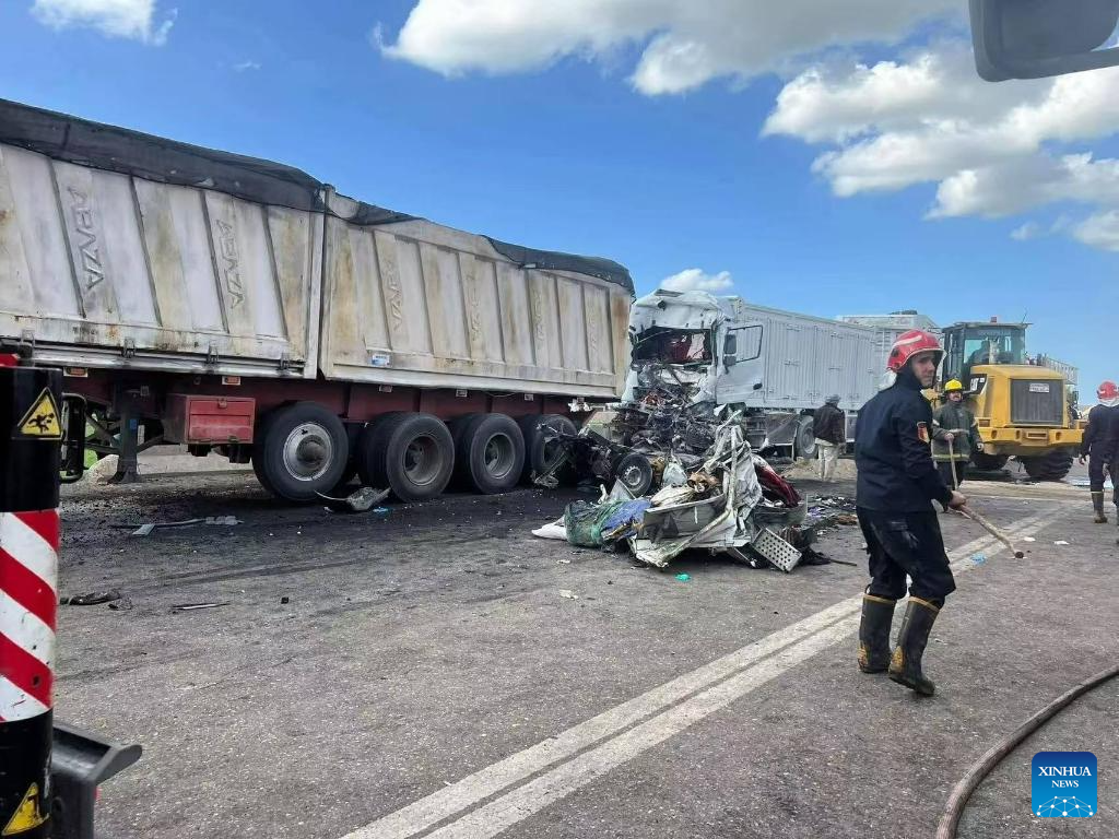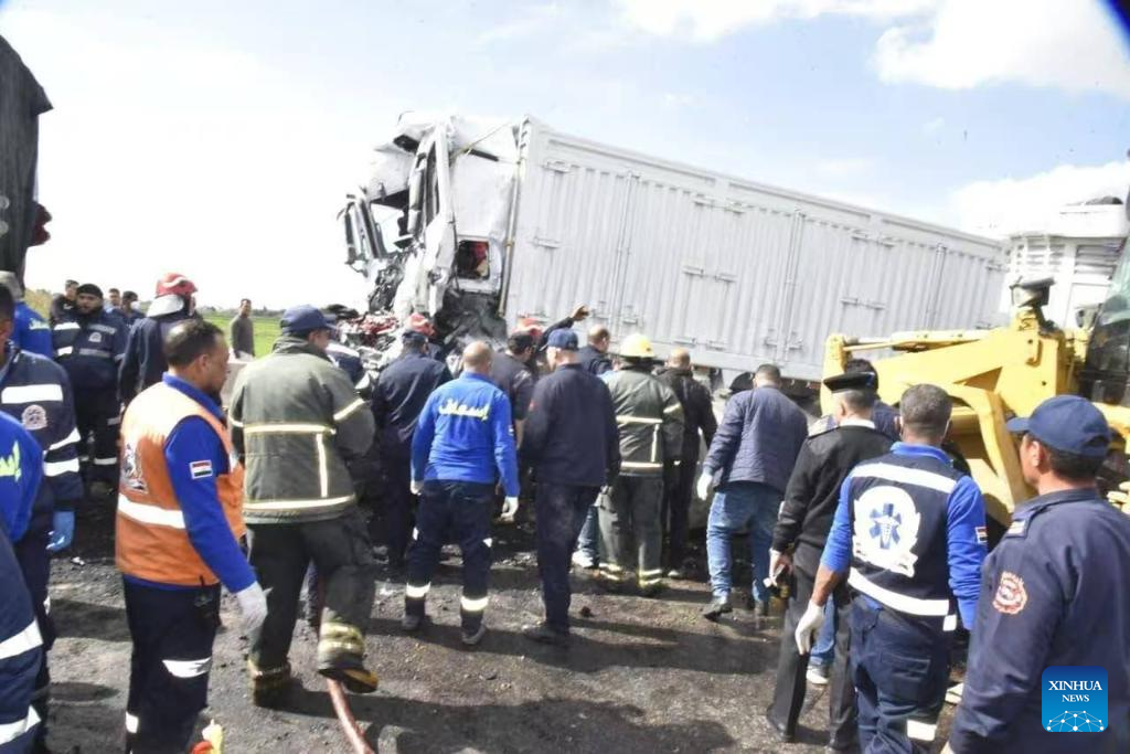 Imagen del 19 de febrero de 2026 del sitio de un accidente luego de la colisión de dos camiones, en la provincia de Puerto Said, en el noreste de El Cairo, Egipto. Al menos 18 personas murieron y otras tres resultaron heridas el jueves en una colisión entre dos camiones en la provincia de Puerto Said, al noreste de El Cairo, de acuerdo con un comunicado de la provincia de Dakahlia, en el norte de Egipto. (Xinhua/Str)