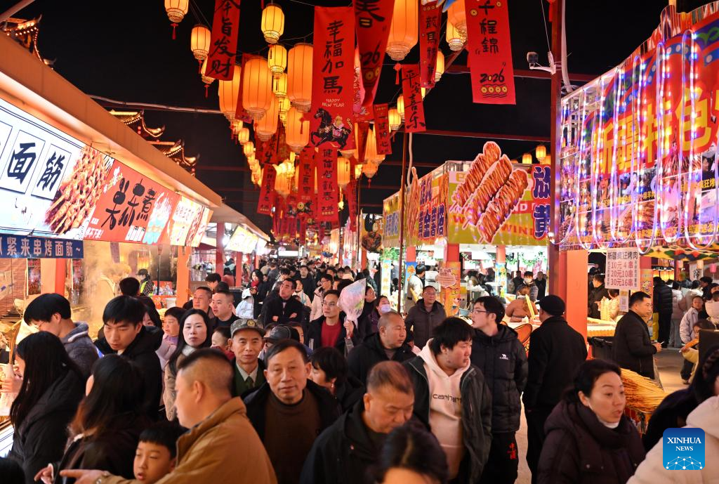 BEIJING, 20 febrero, 2026 (Xinhua) -- Imagen del 19 de febrero de 2026 de turistas visitando una exposición de linternas en una feria del templo, en la ciudad de Shangqiu, en la provincia de Henan, en el centro de China. El Ministerio de Cultura y Turismo de China lanzó una campaña cultural y turística de un mes de duración previo a la Fiesta de la Primavera, que incluye una amplia gama de actividades y medidas promocionales para satisfacer mejor las necesidades de la población. (Xinhua/Zhu Xiang)