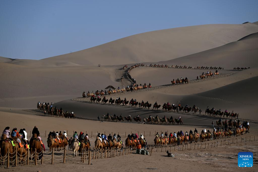 BEIJING, 20 febrero, 2026 (Xinhua) -- Imagen del 19 de febrero de 2026 de turistas visitando el Area Escénica de la Montaña Mingsha y el Manantial de la Luna Creciente, en la ciudad de Dunhuang, en la provincia de Gansu, en el noroeste de China. El Ministerio de Cultura y Turismo de China lanzó una campaña cultural y turística de un mes de duración previo a la Fiesta de la Primavera, que incluye una amplia gama de actividades y medidas promocionales para satisfacer mejor las necesidades de la población. (Xinhua/Zhang Xiaoliang)