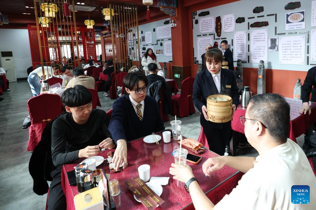 SHENYANG, 21 febrero, 2026 (Xinhua) -- Un trabajador sirve dumplings en Laobian Dumplings, una cadena de restaurantes, en Shenyang, en la provincia de Liaoning, en el noreste de China, el 21 de febrero de 2026. En el quinto día del Año Nuevo Lunar chino, también conocido como "Powu", se celebra en muchas regiones de China la tradición de comer dumplings para alejar el mal y los desastres, atraer la buena suerte y expresar esperanzas para el nuevo año. (Xinhua/Pan Yulong)