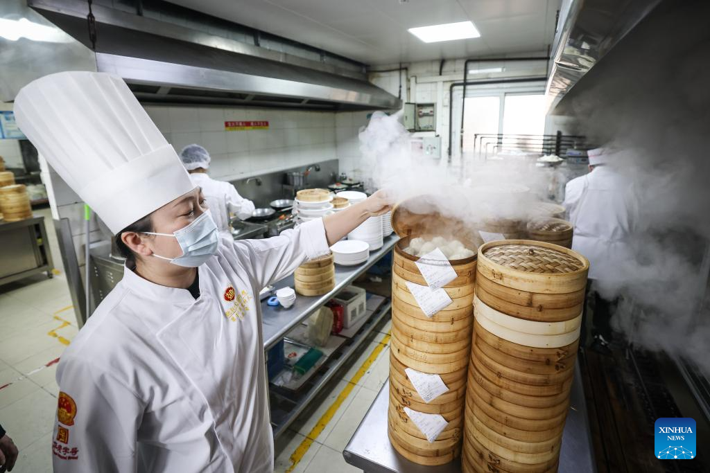 SHENYANG, 21 febrero, 2026 (Xinhua) -- Una trabajadora sirve dumplings en Laobian Dumplings, una cadena de restaurantes, en Shenyang, en la provincia de Liaoning, en el noreste de China, el 21 de febrero de 2026. En el quinto día del Año Nuevo Lunar chino, también conocido como "Powu", se celebra en muchas regiones de China la tradición de comer dumplings para alejar el mal y los desastres, atraer la buena suerte y expresar esperanzas para el nuevo año. (Xinhua/Pan Yulong)