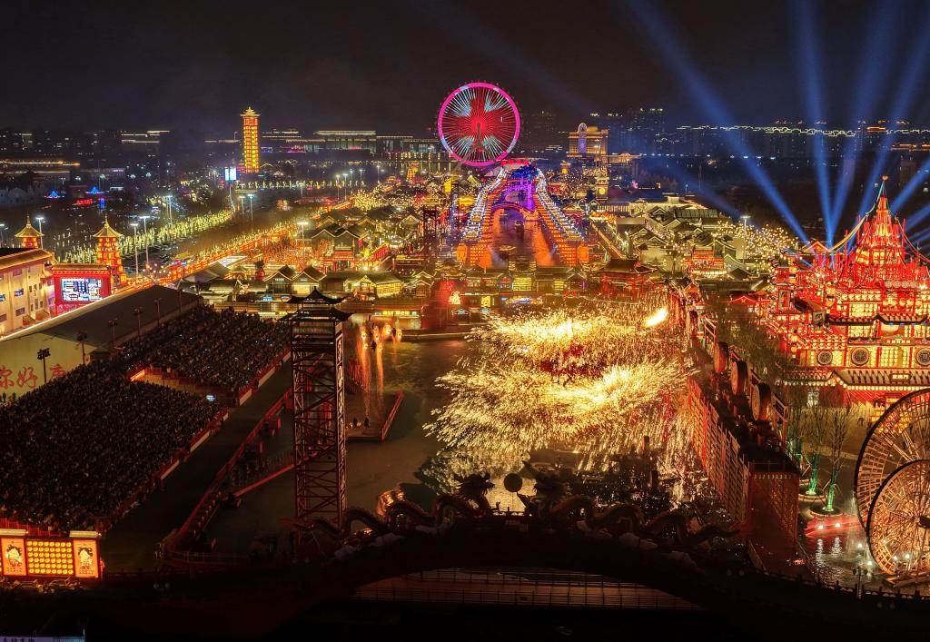 SHIJIAZHUANG, 21 febrero, 2026 (Xinhua) -- Vista aérea tomada con un dron el 20 de febrero de 2026 de un espectáculo de fuegos artificiales de hierro fundido en un bloque cultural, en el distrito de Fengnan, en la ciudad de Tangshan de la provincia de Hebei, en el norte de China. (Xinhua/Yang Shiyao)