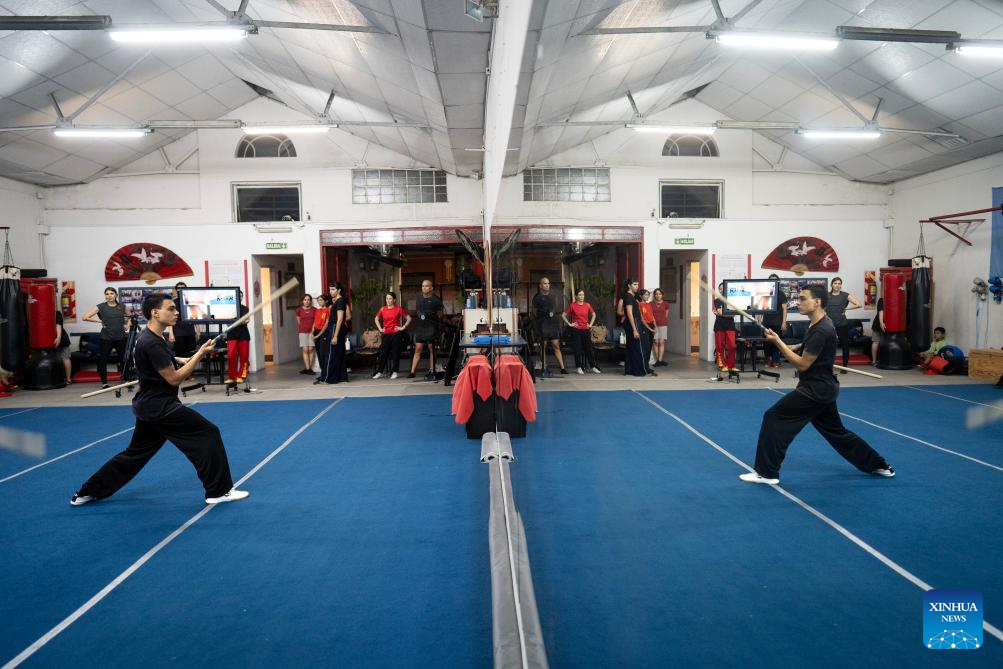 BUENOS AIRES, 18 febrero, 2026 (Xinhua) -- Imagen del 4 de febrero de 2026 de Marcos González (i), un joven de 14 años de edad y practicante de wushu, realizando formas de "San Jie Gun" (El palo de tres secciones) durante una sesión de entrenamiento en el Club Argentino de Wushu, en la ciudad de Buenos Aires, capital de Argentina. La milenaria cultura china y sus múltiples manifestaciones, como la Fiesta de la Primavera, el arte, la música, la danza y el deporte marcial, atrae y enamora a los jóvenes de Argentina, que se suman con entusiasmo, respeto y admiración a la práctica de distintas disciplinas, costumbres y celebraciones originarias del país asiático. (Xinhua/Martín Zabala)