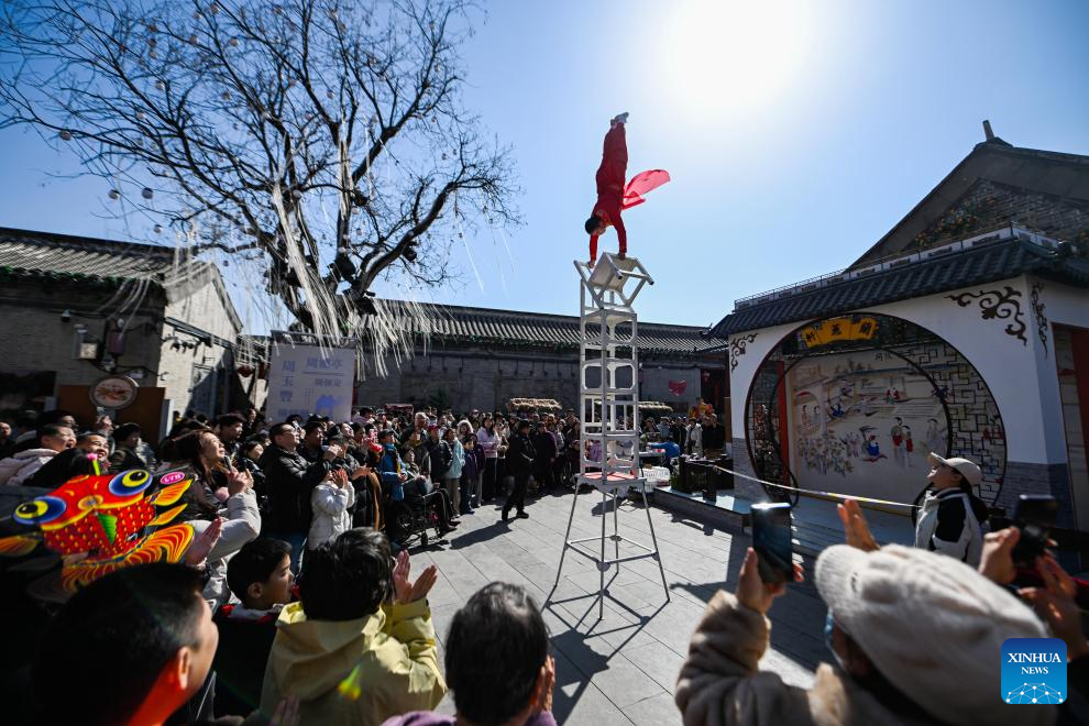 TIANJIN, 22 febrero, 2026 (Xinhua) -- Visitantes observan un espectáculo acrobático, en el poblado antiguo de Yangliuqing, en Tianjin, en el norte de China, el 22 de febrero de 2026. El poblado antiguo de Yangliuqing lanzó una serie de actividades que presentan costumbres populares, cultura tradicional y experiencias interactivas, ofreciendo a los visitantes una fiesta popular inmersiva durante estas vacaciones de la Fiesta de la Primavera. (Xinhua/Zhao Zishuo)