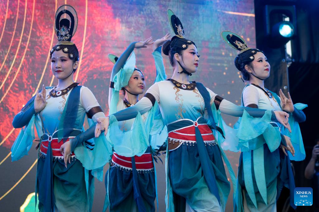 LA PLATA, 22 febrero, 2026 (Xinhua) -- Imagen del 21 de febrero de 2026 de artistas realizando una presentación de una danza tradicional china durante las celebraciones por el Año Nuevo chino en la Plaza Moreno, en la ciudad de La Plata, Argentina. La ciudad argentina de La Plata se sumó el sábado a los festejos por el Año Nuevo chino con un multitudinario y colorido festival frente a la emblemática catedral de la ciudad. (Xinhua/Martín Zabala)