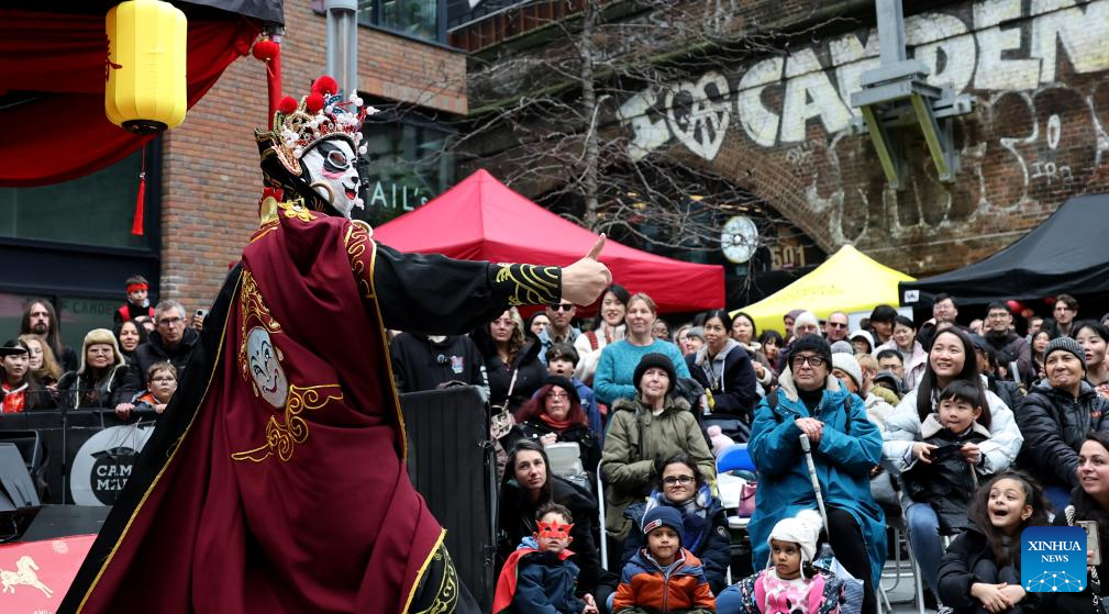 LONDRES, 22 febrero, 2026 (Xinhua) -- Imagen del 21 de febrero de 2026 de personas observando una presentación de cambio de cara de la Opera de Sichuan, durante una celebración del Año Nuevo chino, en el Mercado de Camden, en Londres, Reino Unido. (Xinhua/Li Ying)