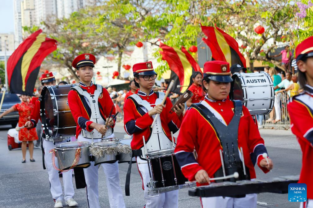 CIUDAD DE PANAMA, 23 febrero, 2026 (Xinhua) -- Imagen del 22 de febrero de 2026 de una banda musical realizando una presentación durante una celebración del Año Nuevo chino, en la Ciudad de Panamá, capital de Panamá. (Xinhua/Daniel González)