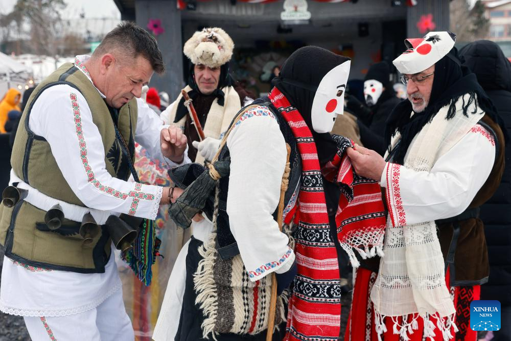 BRANESTI, 23 febrero, 2026 (Xinhua) -- Personas se preparan para el festival anual "Día del Cuco" (Ziua Cucilor), en Branesti, cerca de Bucarest, capital de Rumania, el 23 de febrero de 2026. Grupos de personas enmascaradas participaron en el festival tradicional, cantando y bailando por la buena salud y la fertilidad al comienzo de la primavera. (Xinhua/Cristian Cristel)