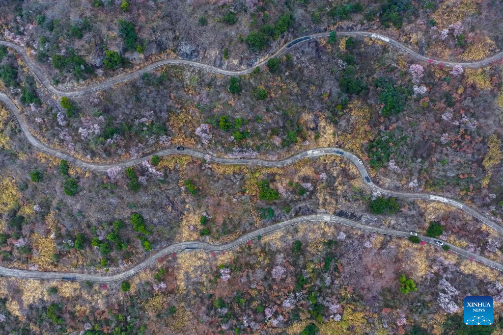 JIANDE, 25 febrero, 2026 (Xinhua) -- Vista aérea tomada con un dron el 25 de febrero de 2026 de las flores de cerezo silvestres, en el poblado de Sandu de la ciudad de Jiande, en la provincia de Zhejiang, en el este de China. Las flores de cerezos silvestres que cubren una gran superficie en el poblado de Sandu están actualmente en plena floración, atrayendo a multitudes de turistas. (Xinhua/Xu Yu)