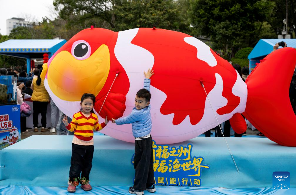 FUZHOU, 25 febrero, 2026 (Xinhua) -- Niños posan para fotografías con un globo en forma de pez dorado en un parque, en Fuzhou, en la provincia de Fujian, en el sureste de China, el 25 de febrero de 2026. Las habilidades de cría de peces dorados de Fuzhou, un patrimonio cultural inmaterial provincial de Fujian, se han transmitido de generación en generación, lo que le ha otorgado fama mundial a esta variedad de peces dorados. (Xinhua/Wei Peiquan)