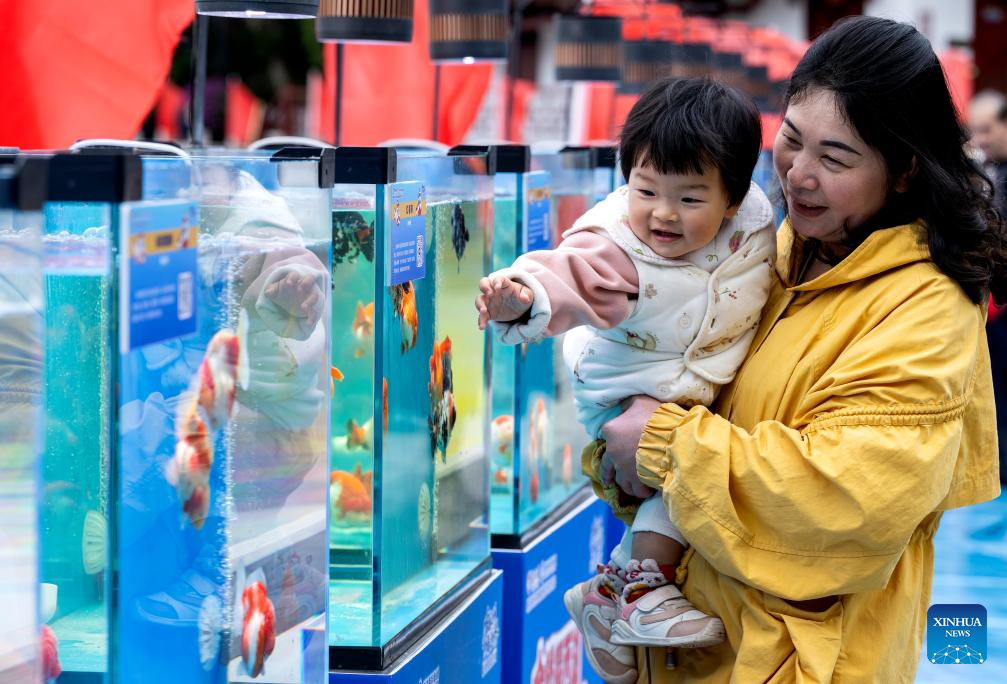 FUZHOU, 25 febrero, 2026 (Xinhua) -- Personas observan peces dorados en un parque, en Fuzhou, en la provincia de Fujian, en el sureste de China, el 25 de febrero de 2026. Las habilidades de cría de peces dorados de Fuzhou, un patrimonio cultural inmaterial provincial de Fujian, se han transmitido de generación en generación, lo que le ha otorgado fama mundial a esta variedad de peces dorados. (Xinhua/Wei Peiquan)