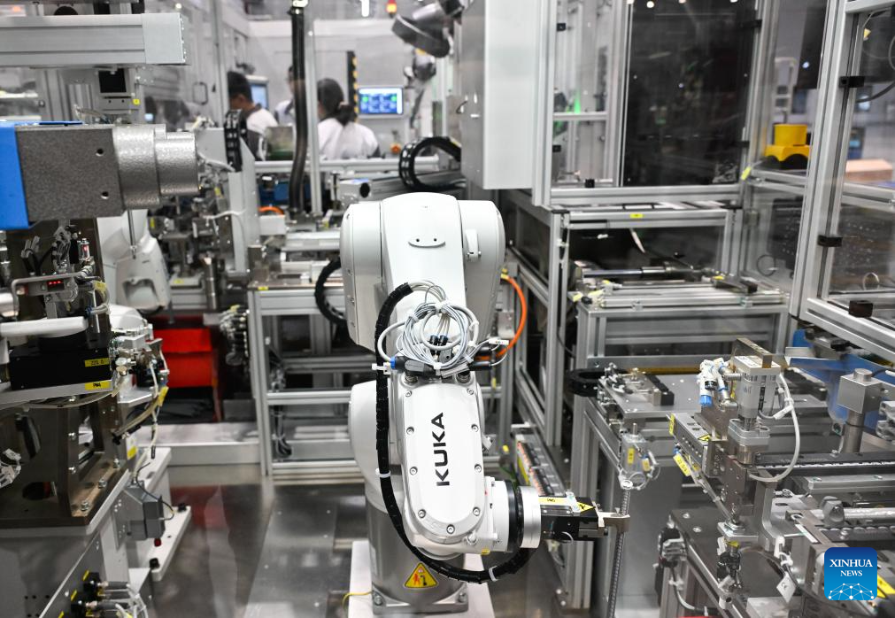 TAICANG, 25 febrero, 2026 (Xinhua) -- Un brazo robótico trabaja en el taller de la compañía de gestión empresarial de tecnología automotriz Brose, en Taicang, en la provincia de Jiangsu, en el este de China, el 25 de febrero de 2026. La ciudad de Taicang ha incentivado a las empresas alemanas a aumentar continuamente su inversión y expandir su producción mediante la celebración de eventos del "Día de Taicang" en Alemania y la creación de un canal ecológico para las empresas con financiación alemana. El primer parque industrial de educación vocacional de sistema dual chino-alemán de China, construido en Taicang, ha formado más de diez mil talentos profesionales altamente calificados. (Xinhua/Ji Chunpeng)