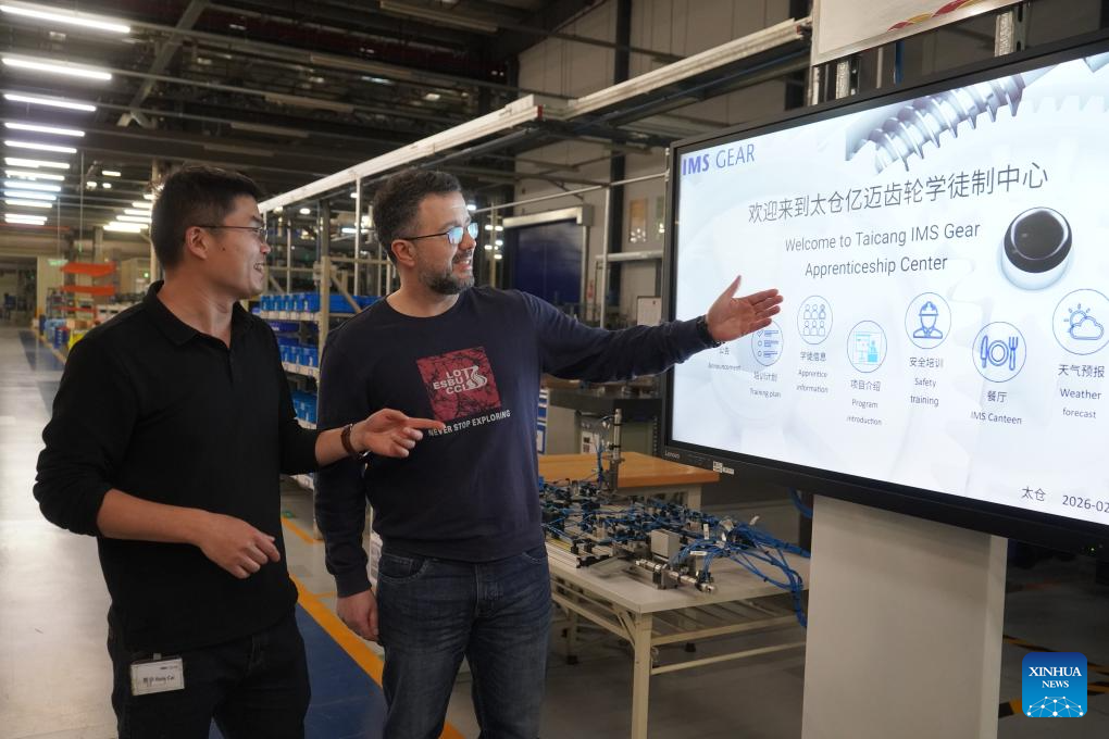 TAICANG, 25 febrero, 2026 (Xinhua) -- Imagen del 24 de febrero de 2026 del entrenador Thomas Pastore (d) explicando la formación del sistema dual en Taicang IMS Gear, en Taicang, en la provincia de Jiangsu, en el este de China. La ciudad de Taicang ha incentivado a las empresas alemanas a aumentar continuamente su inversión y expandir su producción mediante la celebración de eventos del "Día de Taicang" en Alemania y la creación de un canal ecológico para las empresas con financiación alemana. El primer parque industrial de educación vocacional de sistema dual chino-alemán de China, construido en Taicang, ha formado más de diez mil talentos profesionales altamente calificados. (Xinhua/Liu Zhenrui)
