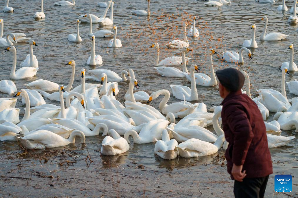 CHAOYANG, 26 febrero, 2026 (Xinhua) -- Imagen del 25 de febrero de 2026 de un hombre alimentando a cisnes junto al río Daling, en la ciudad de Chaoyang, en la provincia de Liaoning, en el noreste de China. Bandadas de cisnes migran aquí desde principios del invierno, atrayendo a muchos turistas. (Xinhua/Hu Jingwen)