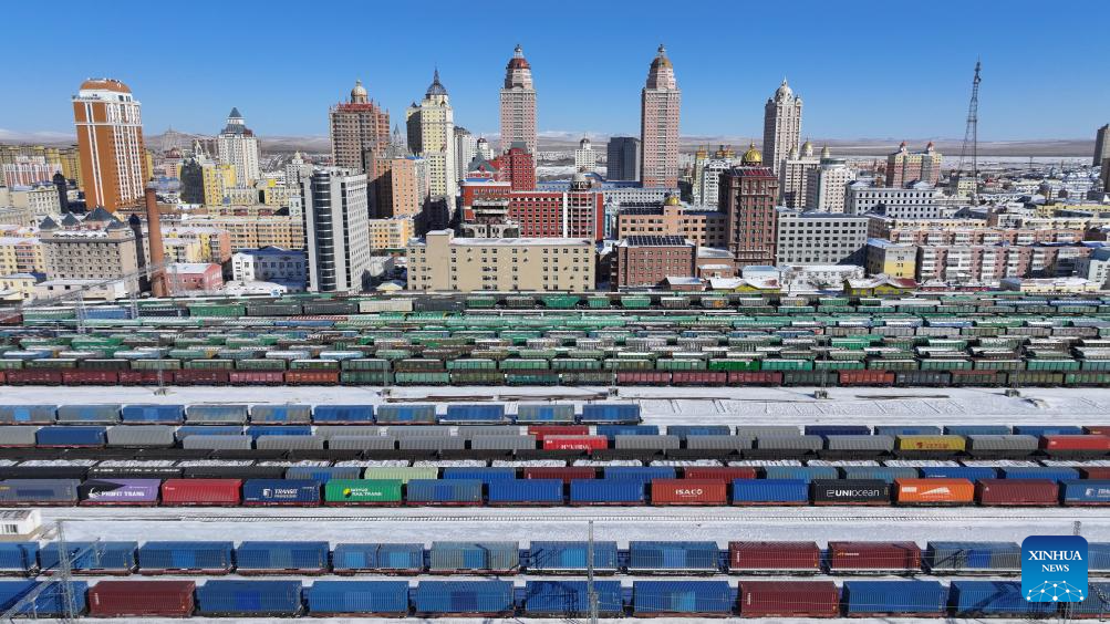 HARBIN, 26 febrero, 2026 (Xinhua) -- Vista aérea tomada con un dron el 26 de febrero de 2026 de los trenes de carga China-Europa esperando por la salida de ida en la Estación del Ferrocarril de Manzhouli, en la ciudad de Manzhouli, en la región autónoma de Mongolia Interior, en el norte de China. Hasta el 26 de febrero de 2026, el corredor oriental de la red de trenes de carga China-Europa ha sido testigo de más de 1.000 viajes en tren en sus líneas ferroviarias este año, rompiendo la marca 26 días antes que el año pasado. (Xinhua/Huang Xu)