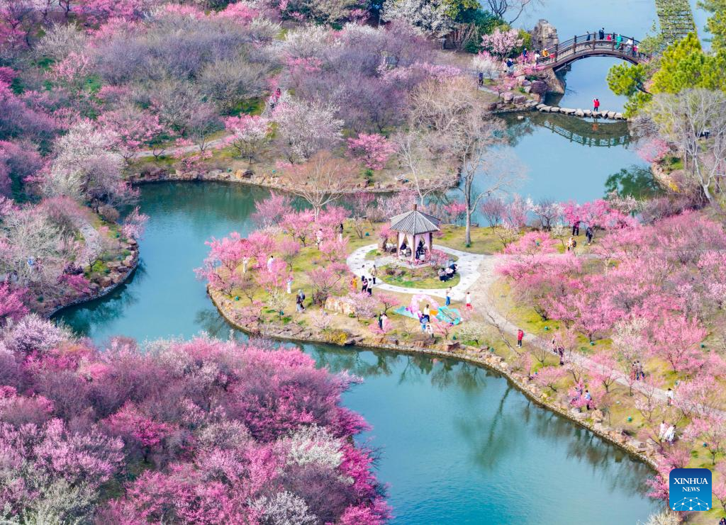 BEIJING, 27 febrero, 2026 (Xinhua) -- Vista aérea tomada con un dron el 25 de febrero de 2026 de turistas visitando la montaña Meihua en el área escénica del Mausoleo Imperial de Xiaoling de Nanjing, en la provincia de Jiangsu, en el este de China. (Xinhua/Yang Suping)