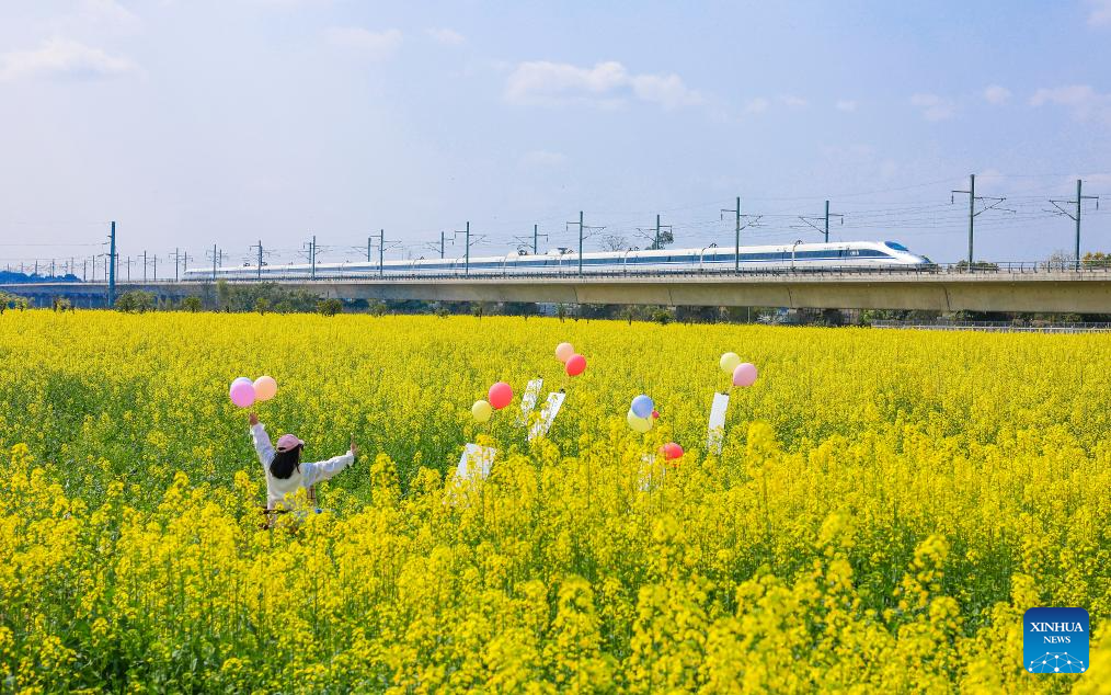 BEIJING, 27 febrero, 2026 (Xinhua) -- Imagen del 26 de febrero de 2026 de una turista visitando un campo de flores de colza mientras circula un tren de alta velocidad, en el distrito de Longmatan de Luzhou, en la provincia de Sichuan, en el suroeste de China. (Xinhua/Mou Ke)